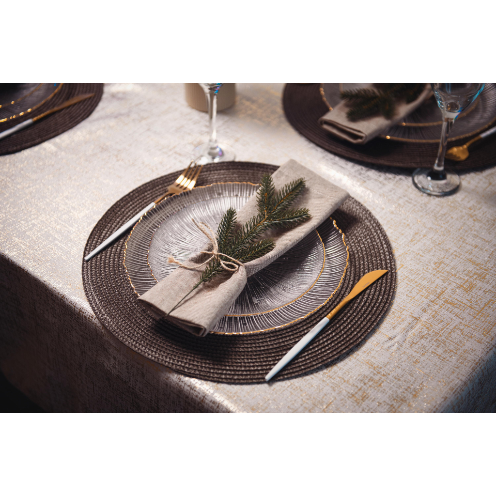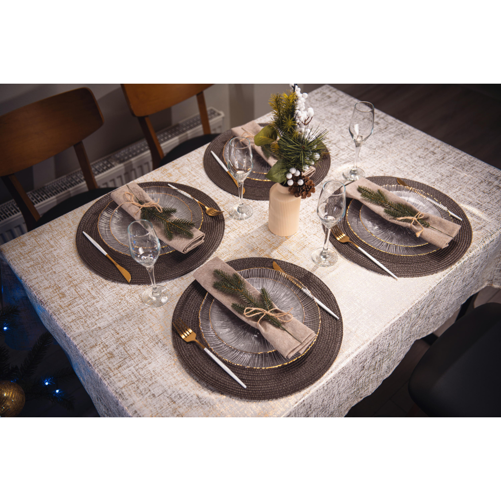 Скатертина Ardesto Shine – це стильний та функціональний елемент декору для вашого столу. Виготовлена з 100% поліестеру, вона має елегантний золотавий колір, що додає розкоші будь-якому інтер'єру. Прямокутна форма розміром 120х140 см і декорування з принтом роблять цю скатертину ідеальним вибором для святкових подій та повсякденного використання.