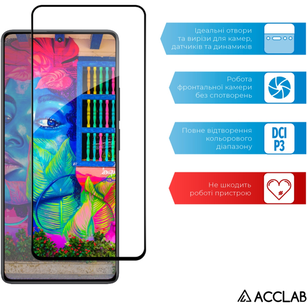 Скло має повне клейове покриття, що забезпечує легкість установки та максимальну площу контакту з екраном. Це запобігає потраплянню бруду та пилу між склом і дисплеєм. Використовуючи захисне скло ACCLAB, ви не тільки подовжите термін служби вашого смартфона, але й збережете його естетичний вигляд.