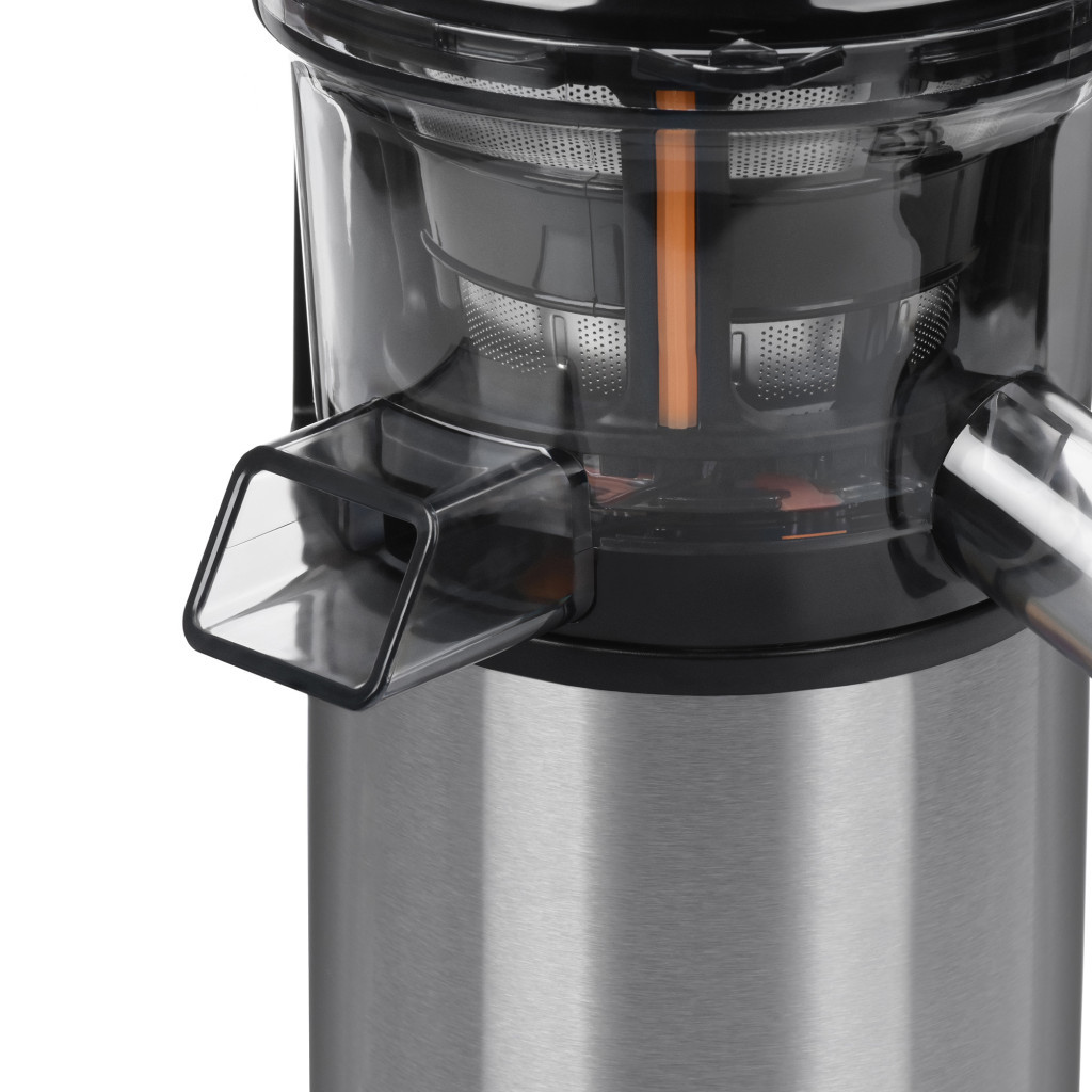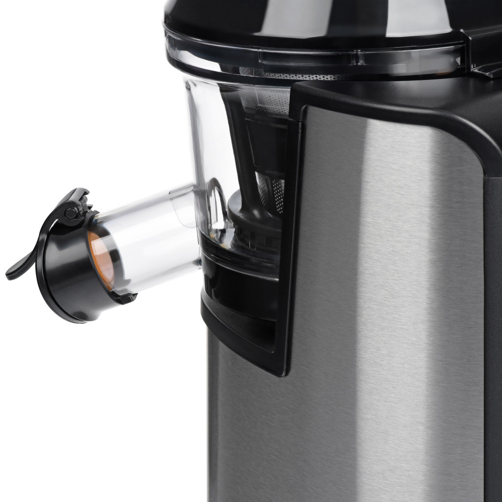 Захист двигуна від перегріву. Пристрій дуже простий у догляді і легко миється. Надійності і довговічності сприяє наявність захисту двигуна від перегріву. Соковижималка отримала прогумовані ніжки. Завдяки чому, вона стійко стоїть на столі і не ковзає під час роботи. У комплектацію входять: 1 ємність для макухи і 1 для соку, а також щіточка для очищення. Конструкція соковижималки передбачає легке очищення і складання.