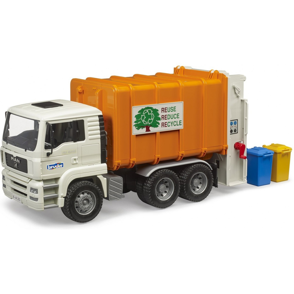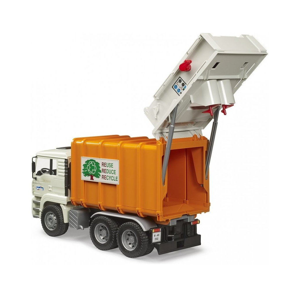 Ігровий набір Bruder Сміттєвоз MAN TGA – маленька копія справжнього сміттєвоза масштабом 1:16. Його деталізація досконала і точно повторює зовнішній вигляд справжнього сміттєвоза MAN: кабіна пофарбована в білий колір, з прозорим склом, складними дзеркалами заднього виду, салон кабіни деталізований. Кабіна нахиляється і можна розглянути блок двигуна. Автомобільний кузов пофарбований яскраво-жовтим кольором, ззаду доповнений пультом управління і двома сміттєвими баками для відходів. Їздить сміттєвоз на великих колесах плавно завдяки м’яким гумовим шинам із протектором. Крім ідеальної зовнішньої схожості, іграшка функціональна. Завантаж відходи з маленьких баків у кузов, а потім, за допомогою ручки ущільни їх у кузові. Сміття переміщується всередину і утрамбовується немов у справжньому сміттєвозі завдяки спіральному конвеєру, а ти можеш спостерігати за цим захопливим процесом. Багажник можна відкрити і зафіксувати, щоб звільнити від сміття. Після цього процесу можна знову їхати, щоб наводити в місті чистоту. Така машина сподобається не тільки дітям, а й дорослим. Гра з нею чудово розвиває дитячу фантазію та мислення.