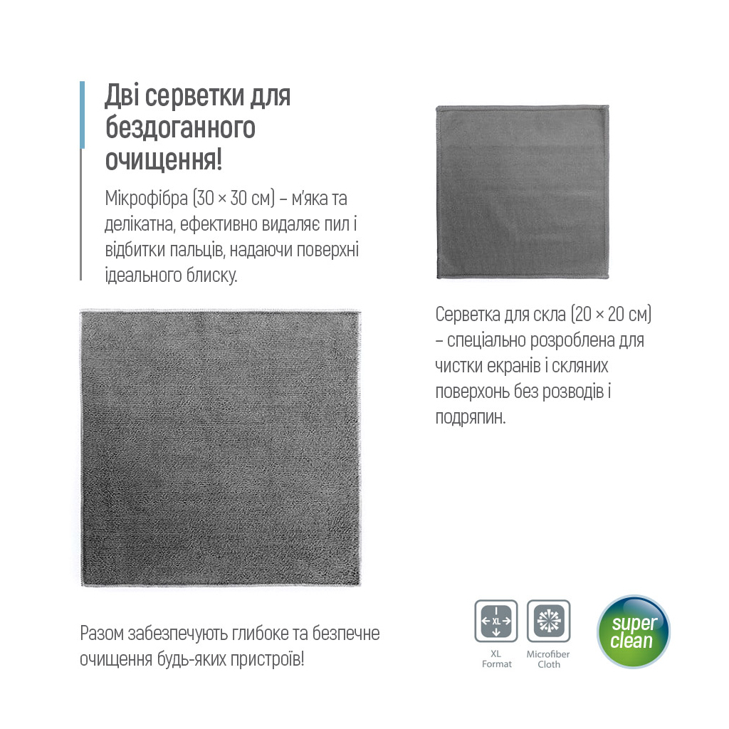 - Дві серветки для ретельного очищення: Мікрофібра (30 × 30 см) – для полірування, Серветка для скла (20 × 20 см) – для ідеальної чистоти