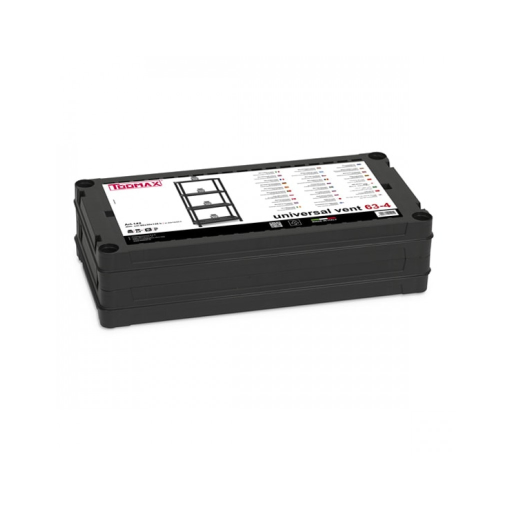 Універсальний пластиковий стелаж на 4 полиці Universal Vent 63-4. Стелаж можна застосовувати для побутових потреб: зберігання будь-яких неважких речей в будинку, гаражі, офісі. Так само, використовують для зберігання або демонстрації товарів в магазинах, торгових рядах, невеликих складах, підсобних приміщеннях. Пластиковий стелаж чорного кольору не мазкий і відмінно впишеться в будь-який інтер’єр. Пластик, на відміну від металу і дерева, не схильний до корозії, йому не страшна волога. Пластикові стелажі не вимагають фарбування, а легка збірка і невелика вага роблять їх дуже практичними і зручними при експлуатації і транспортуванні.