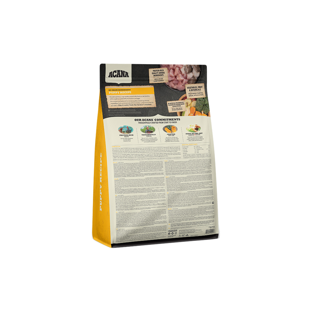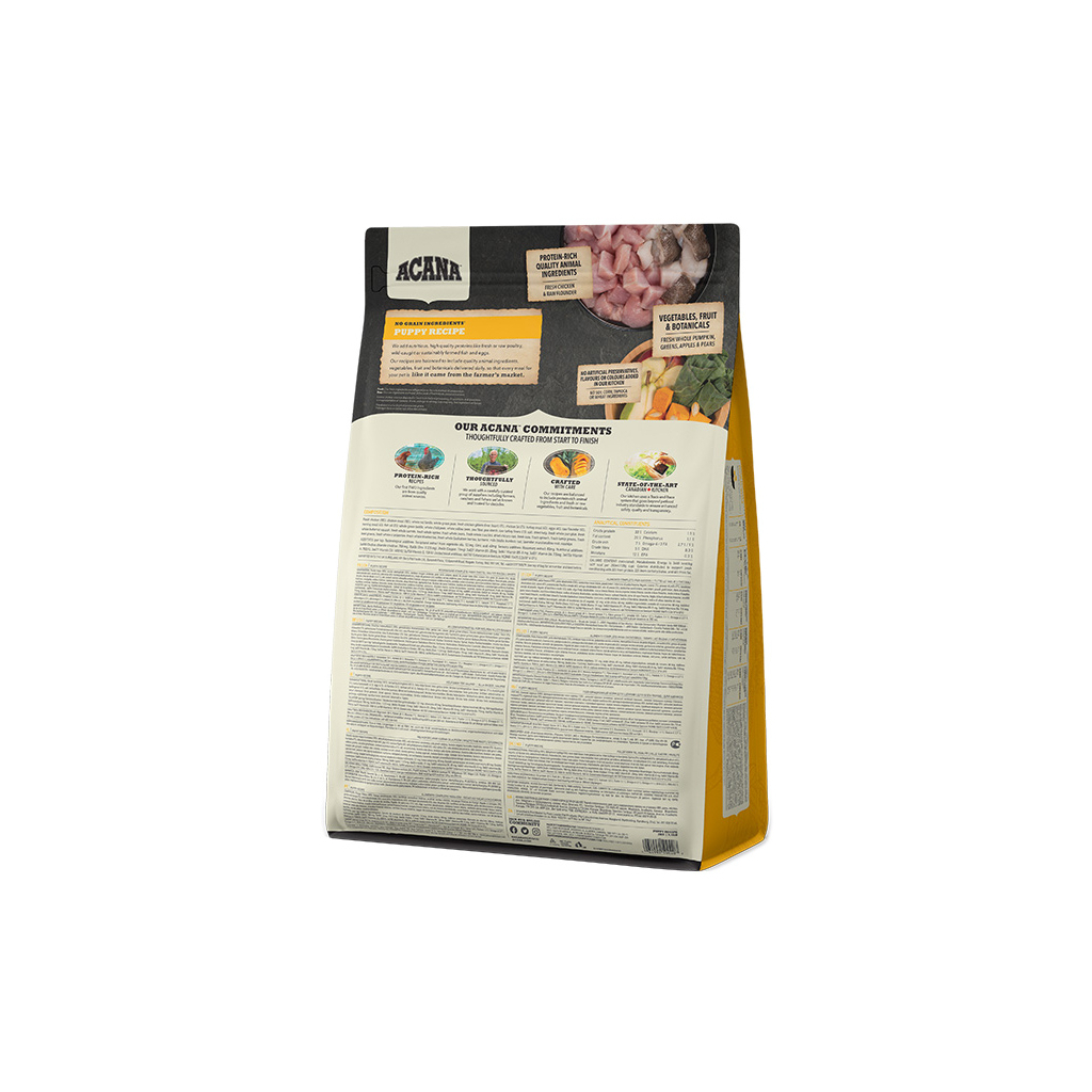 Сухий корм для собак ACANA Puppy Recipe спеціально розроблений для цуценят усіх порід. Цей корм містить 70% якісних м’ясних інгредієнтів, таких як м’ясо канадських курчат, та 30% фруктів, овочів і трав, що забезпечує збалансоване харчування для швидкого росту і розвитку вашого цуценяти. ACANA використовує лише свіжі, регіональні інгредієнти, які доставляються на кухні компанії щодня. Кожна порція корму містить необхідні протеїни та нутрієнти, що підтримують здоров’я вашого улюбленця.