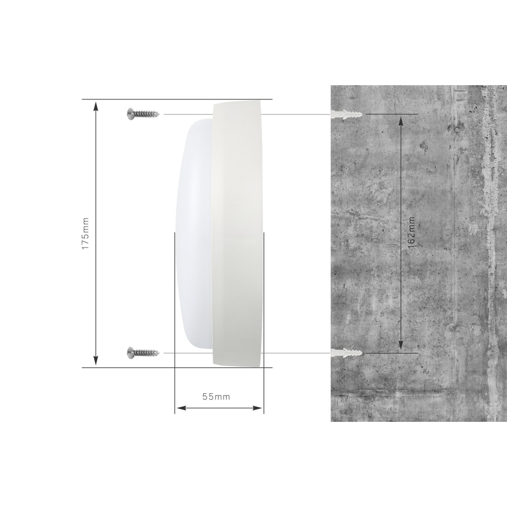 Основні технічні характеристики включають: світлодіодна панель з колірною температурою 5000 K, що забезпечує нейтральне біле світло, та клас захисту IP54, що гарантує вологозахист. Світильник має круглу форму, накладний тип монтажу та розміри ø 170 x 55 мм. Робоча температура варіюється від -20°С до +50°С, а термін служби складає до 20 000 годин.