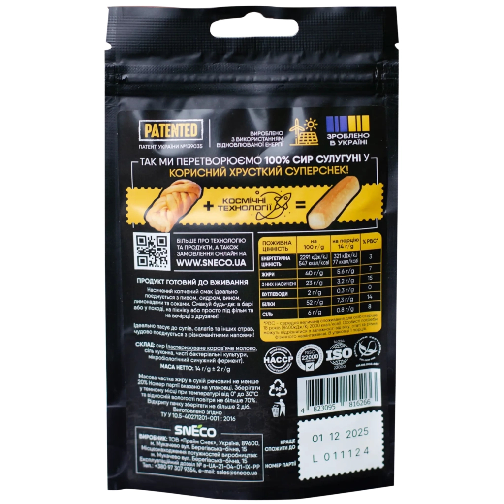Сир сушений snEco Сулугуні 14 г — це унікальний продукт, виготовлений за запатентованою технологією, яка підсилює смак натурального сиру без додавання глутаматів та інших добавок. Процес обробки робить сир неймовірно повітряним і хрустким, що робить його ідеальним для дружніх зустрічей.