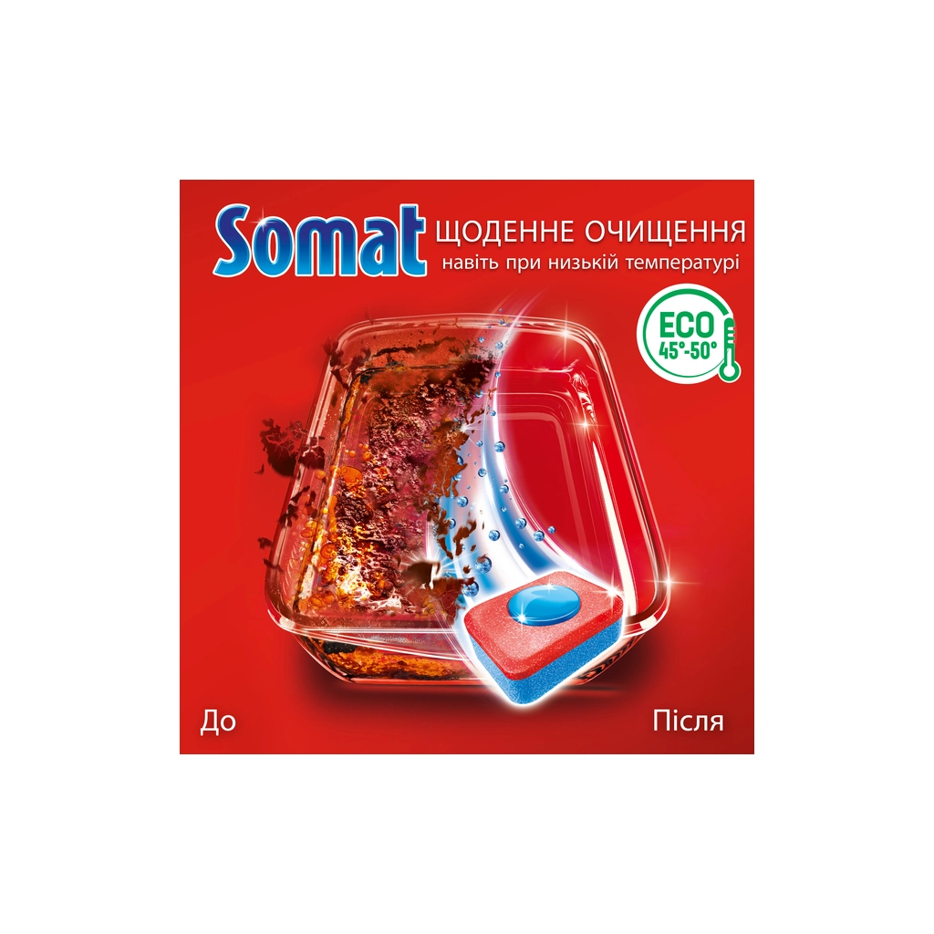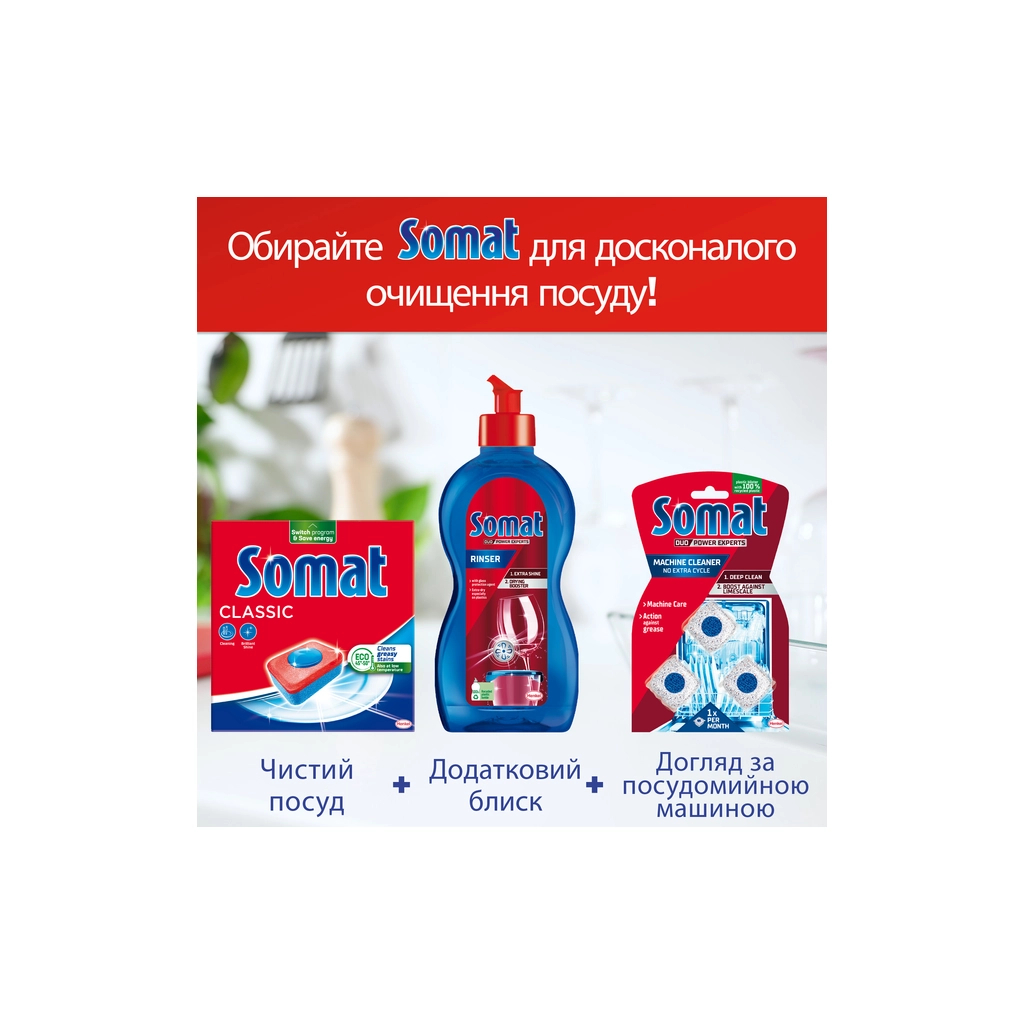 Для досконалого результату використовуйте разом з ополіскувачем Somat для блиску Вашого посуду без розводів та сіллю Somat для захисту від вапняного нальоту та подовження терміну експлуатації посудомийної машини.