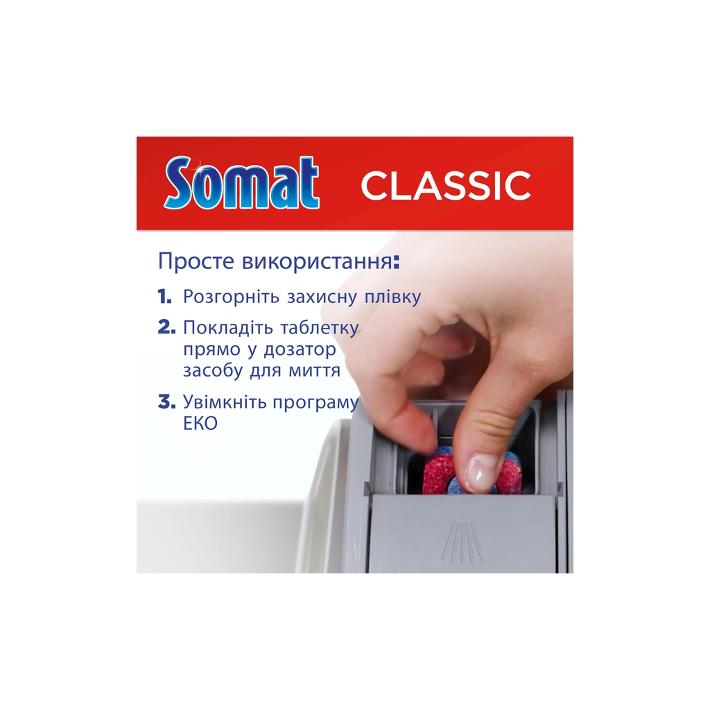 Таблетки для посудомийної машини Somat Classic для чистого та блискучого посуду навіть при низькій температурі в режимі Eco та на коротких циклах миття посуду!