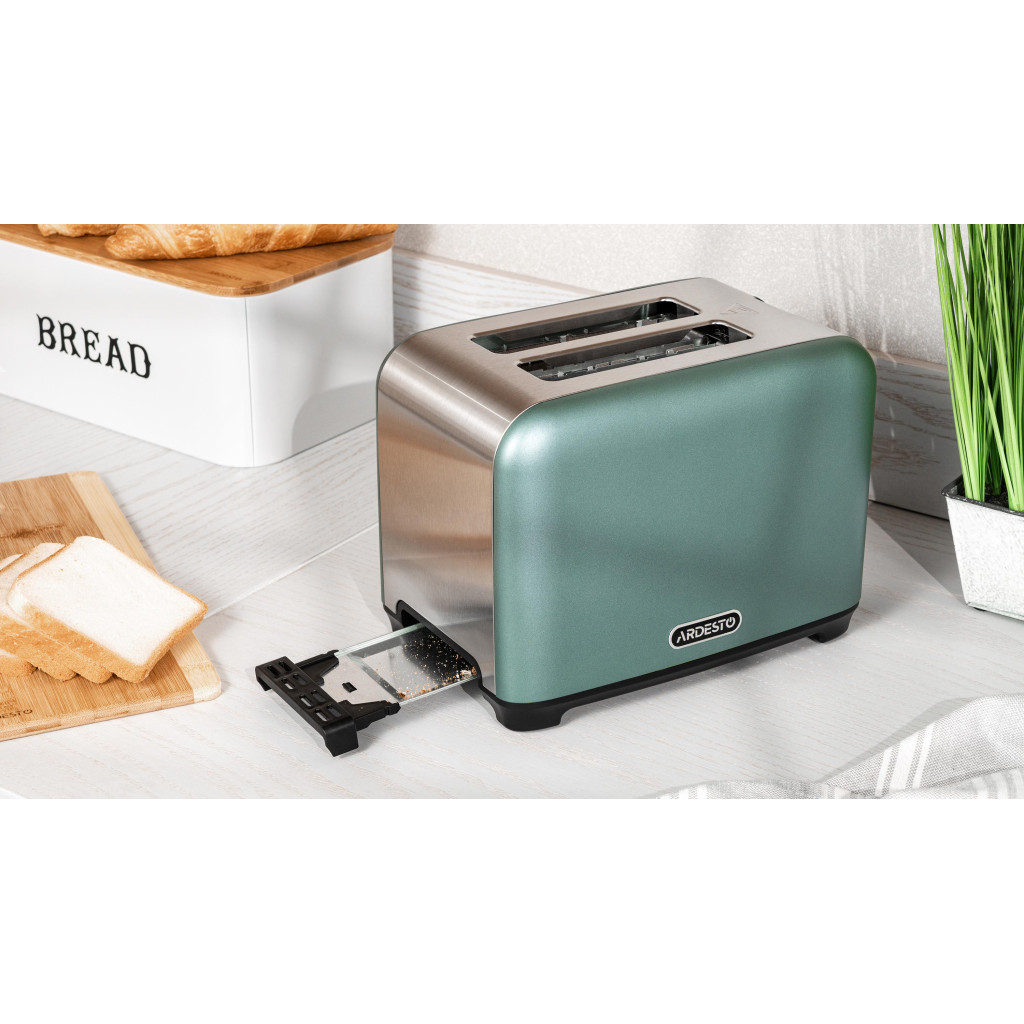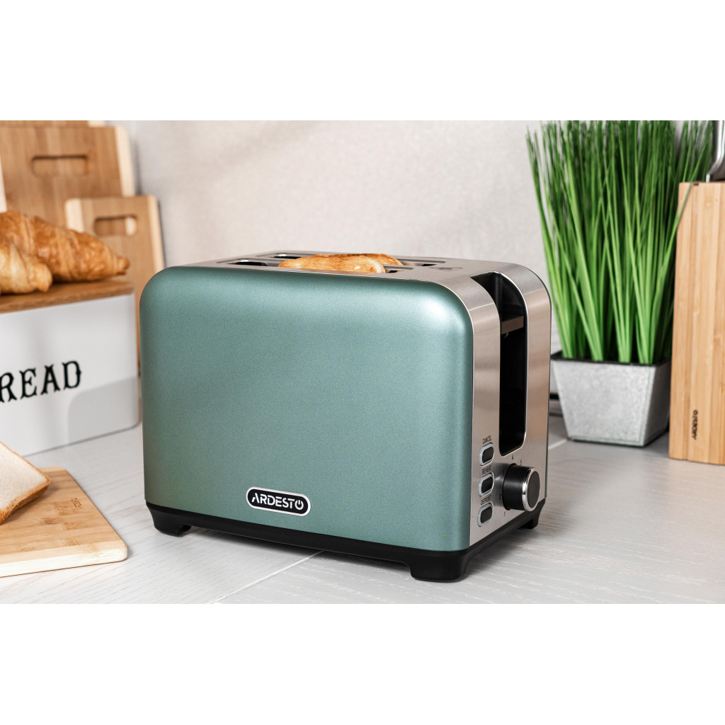 Тостер Ardesto T-F400G виготовлений із нержавіючої сталі з м’ятними вставками. Завдяки інноваціям він стане надійним помічником кожної господині, яка бажає балувати рідних смаколиками. У тостері можна обсмажити відразу два хлібці з обох боків. Ступінь прожарювання – 7 рівнів – можна вибрати за допомогою ручки. Якщо готові тости охолонули, можна скористатися функцією обігріву. При використанні замороженого хліба стане в нагоді функція розморожування.