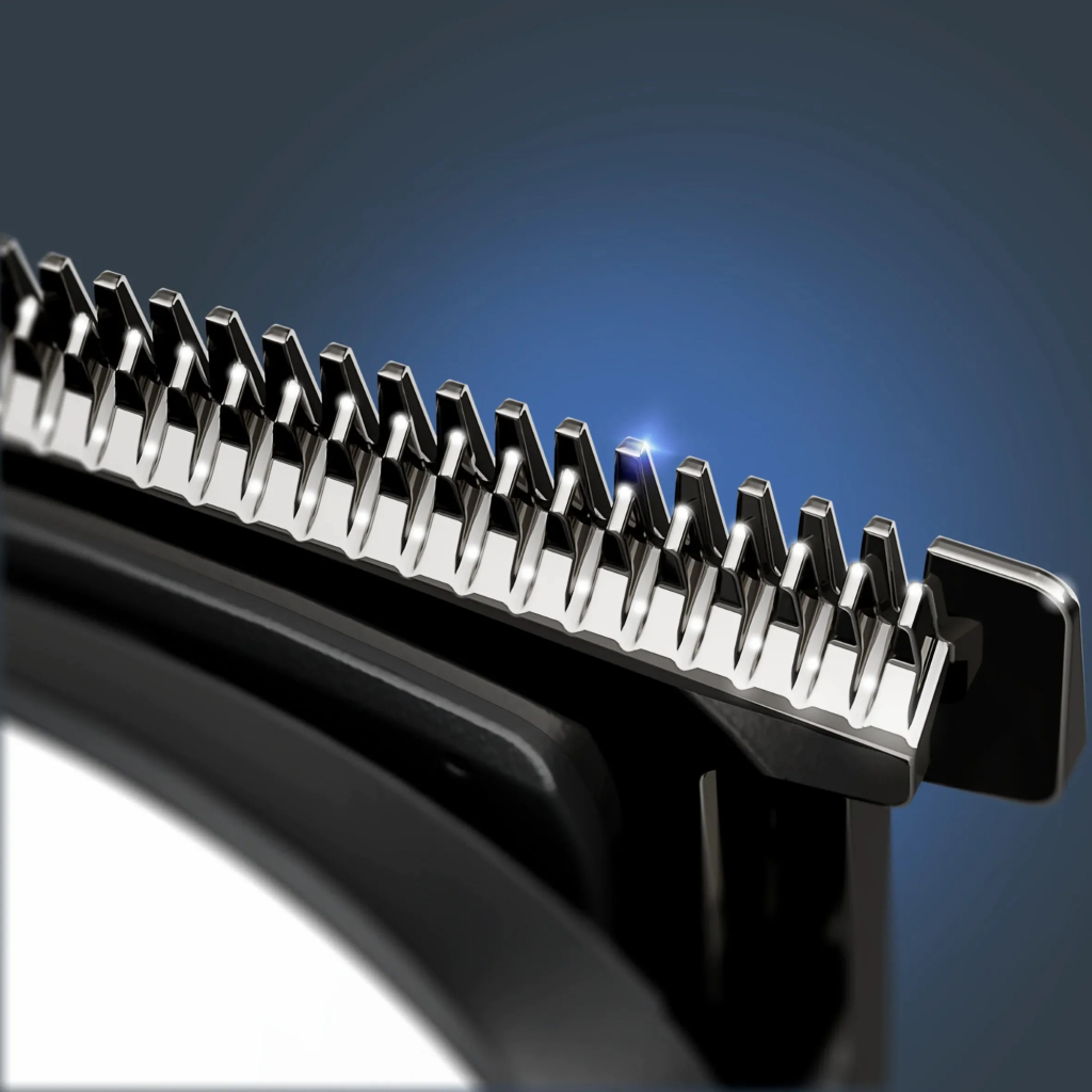 Основні технічні характеристики включають: матеріал лез – сталь, кількість бритвених головок – 1, мінімальна довжина – до 1 мм, максимальна довжина – 18 мм. Тример працює від мережі та має акумулятор, що забезпечує до 60 хвилин автономної роботи після 8 годин зарядки. LED дисплей дозволяє зручно контролювати рівень заряду.