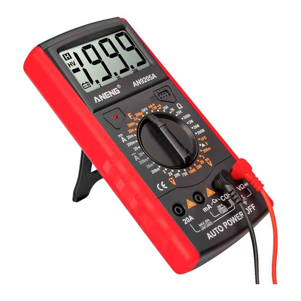 Цифровий мультиметр ANENG AN9205A – це надійний інструмент для вимірювання електричних параметрів. Завдяки ЖК-дисплею, ви зможете легко читати результати вимірювань. Цей мультиметр підтримує вимірювання напруги (V), струму (A), опору (R), частоти (F) та тестування транзисторів. Максимальні значення вимірювань включають напругу постійного струму до 1000 V, змінного струму до 750 V, а також постійний і змінний струм до 20 A.