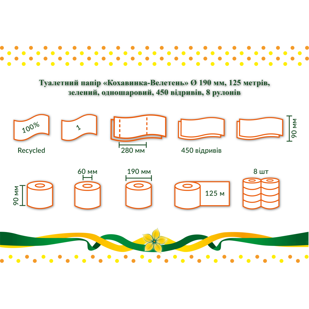 Туалетний папір Кохавинка Велетень – це якісний побутовий рулон, який забезпечить вам комфорт та гігієну у вашому домі. Завдяки своїй довжині 125 метрів та 900 аркушам, цей туалетний папір стане надійним помічником у щоденних потребах.