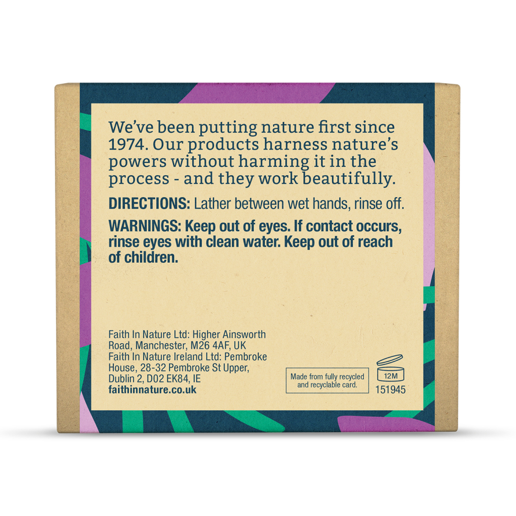 Тверде мило Faith in Nature з лавандою – це натуральне мило, яке збагачене ефірними оліями лаванди, відомими своїми заспокійливими властивостями. Це мило ефективно та м’яко очищує шкіру, видаляючи бруд і бактерії. 100% інгредієнтів натурального походження роблять його ідеальним вибором для тих, хто дбає про своє здоров’я та навколишнє середовище.