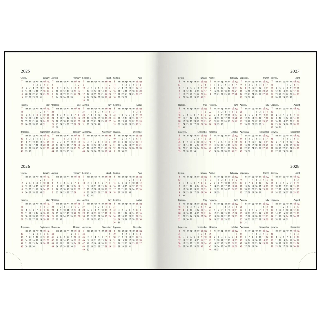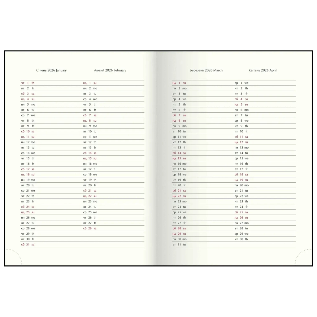 Цей тижневик містить корисну інформацію, таку як коди операторів мобільного зв’язку України, українські державні свята, знаки догляду за одягом, телефонні коди міст, літерні автомобільні коди та таблиця відстаней між обласними центрами України. Використовуйте його для планування справ, запису важливих нотаток та збереження корисної інформації в одному місці.