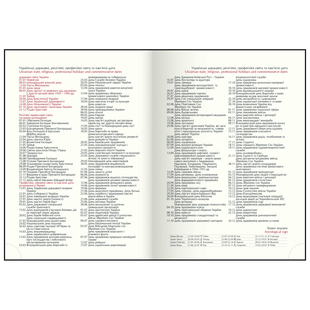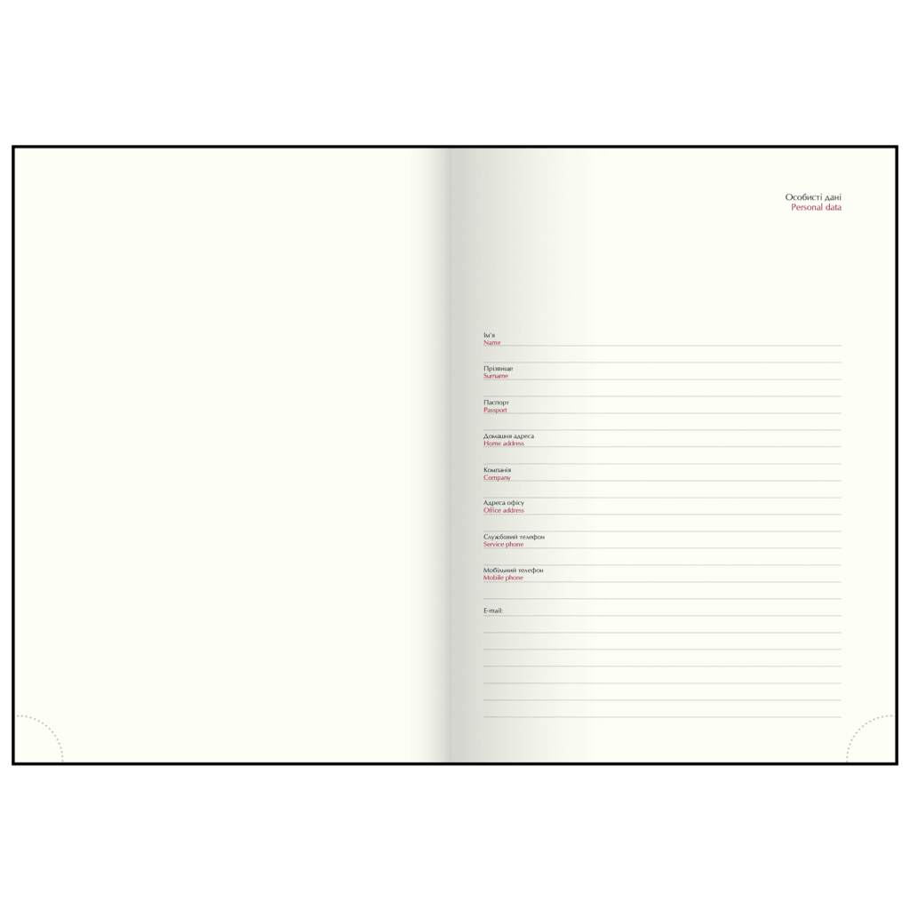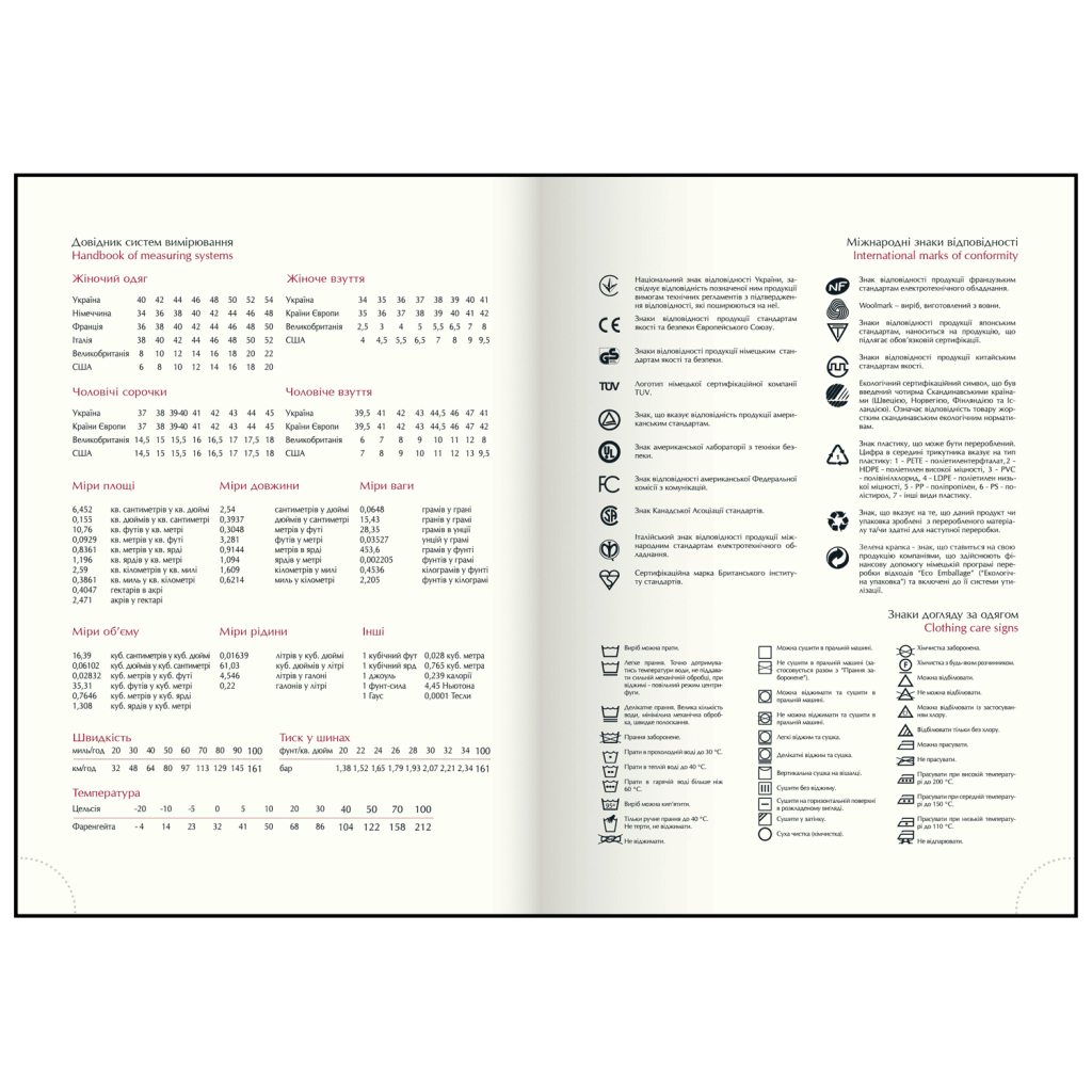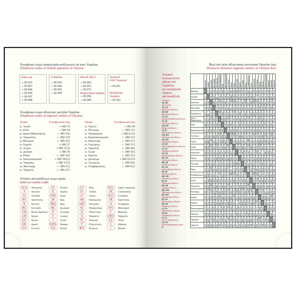 - Додаткові функції: закладка-лясе, перфоровані куточки аркушів, двомовний блок (українська, англійська).