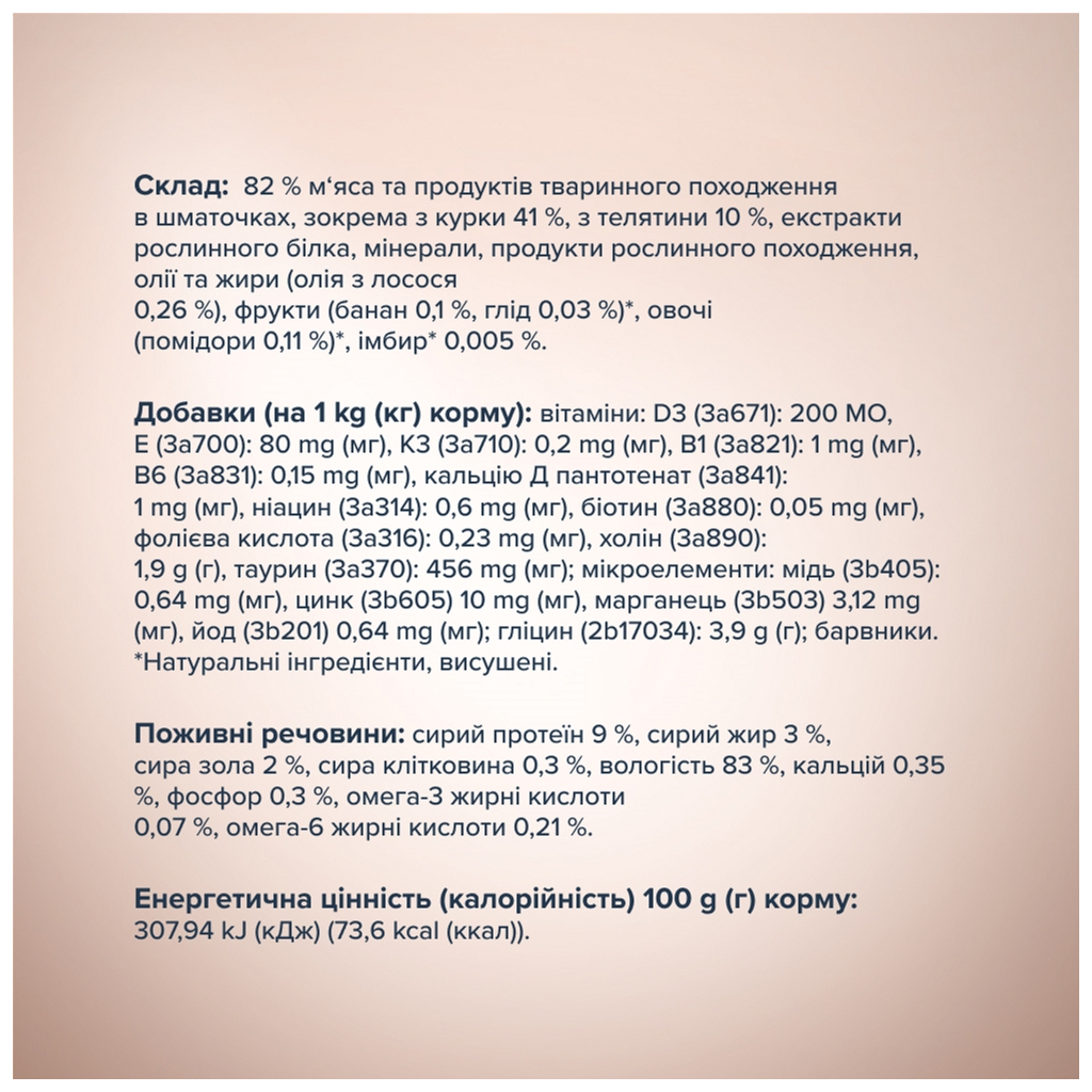 Корм має вагу 80 г і представлений у зручних паучах, що дозволяє легко порціонувати їжу. Основні інгредієнти – курка та телятина, які є джерелом високоякісного білка, необхідного для здоров'я вашого кота. Виробник – Club 4 Paws, країна виробництва – Литва.