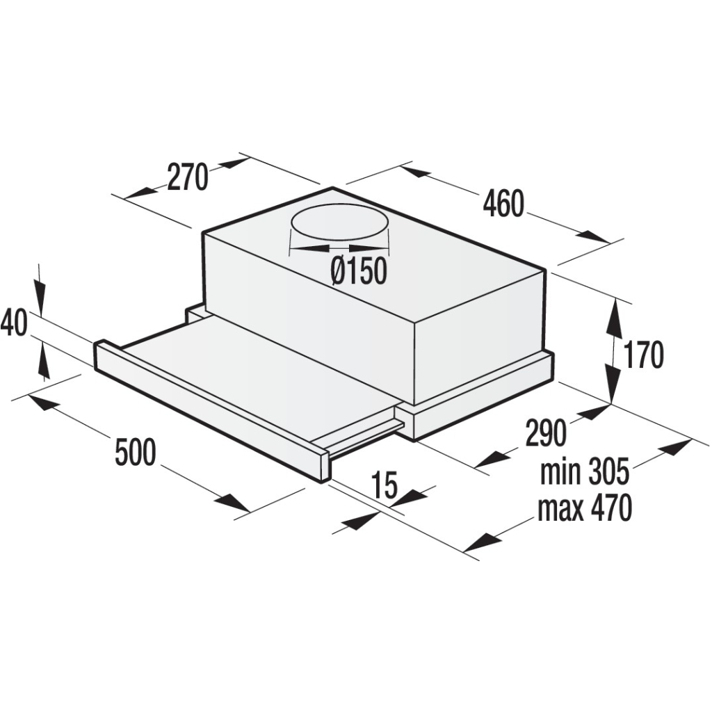 Ця витяжка має продуктивність 322 м3/год та потужність 91 Вт, що робить її потужним помічником у боротьбі з запахами та паром. Вона працює в режимах відведення повітря та рециркуляції, а її ширина корпусу складає 50 см. Діаметр вентиляційної труби – 150 мм, що забезпечує легкість підключення. Корпус виготовлений з нержавіючої сталі, а алюмінієвий фільтр гарантує високу ефективність очищення повітря.