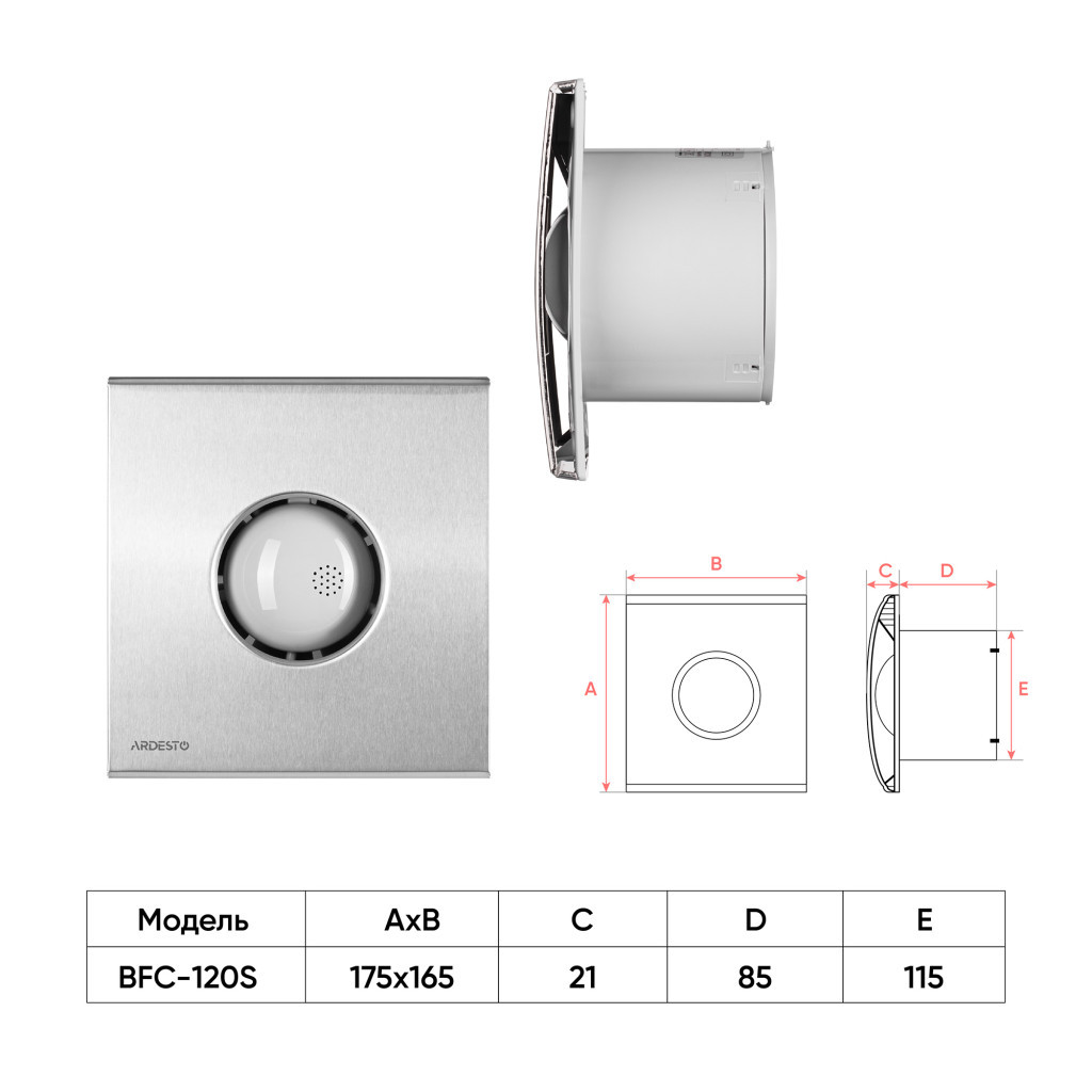 Основні технічні характеристики включають діаметр труби 115 мм, рівень шуму 33 дБ та частоту обертів 2300 об/хв. Монтажна глибина становить 8.5 см, а габарити вентилятора – 175 х 85 х 21 мм. Вага пристрою складає 0.701 кг, а колір – сріблястий. Виробник – Ardesto, країна виробництва – Китай.