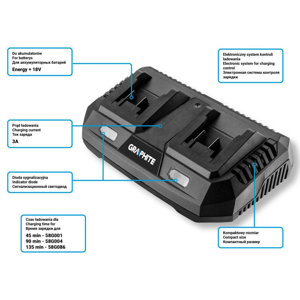 Зарядний пристрій GRAPHITE 58G085 є частиною серії Energy+ і призначений для одночасного заряджання двох 18В Li-Ion акумуляторів. Це забезпечує підвищену ефективність та зручність при роботі з інструментами, що потребують постійного живлення. Завдяки максимальному струму заряду в 3А, ви зможете швидко заряджати акумулятори, що значно зекономить ваш час.
