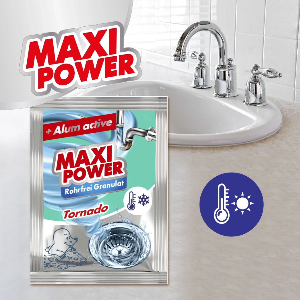 Maxi Power Tornado Гранульований Для холодної води – ефективний засіб для прочищення труб, призначений для боротьби з різноманітними забрудненнями, такими як бактерії, мікроби, жир, засмічення, неприємний запах та залишки мила. Об'єм упаковки складає 80 г, що робить його зручним для використання в домашніх умовах.