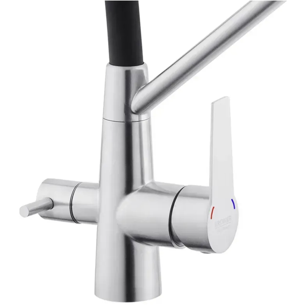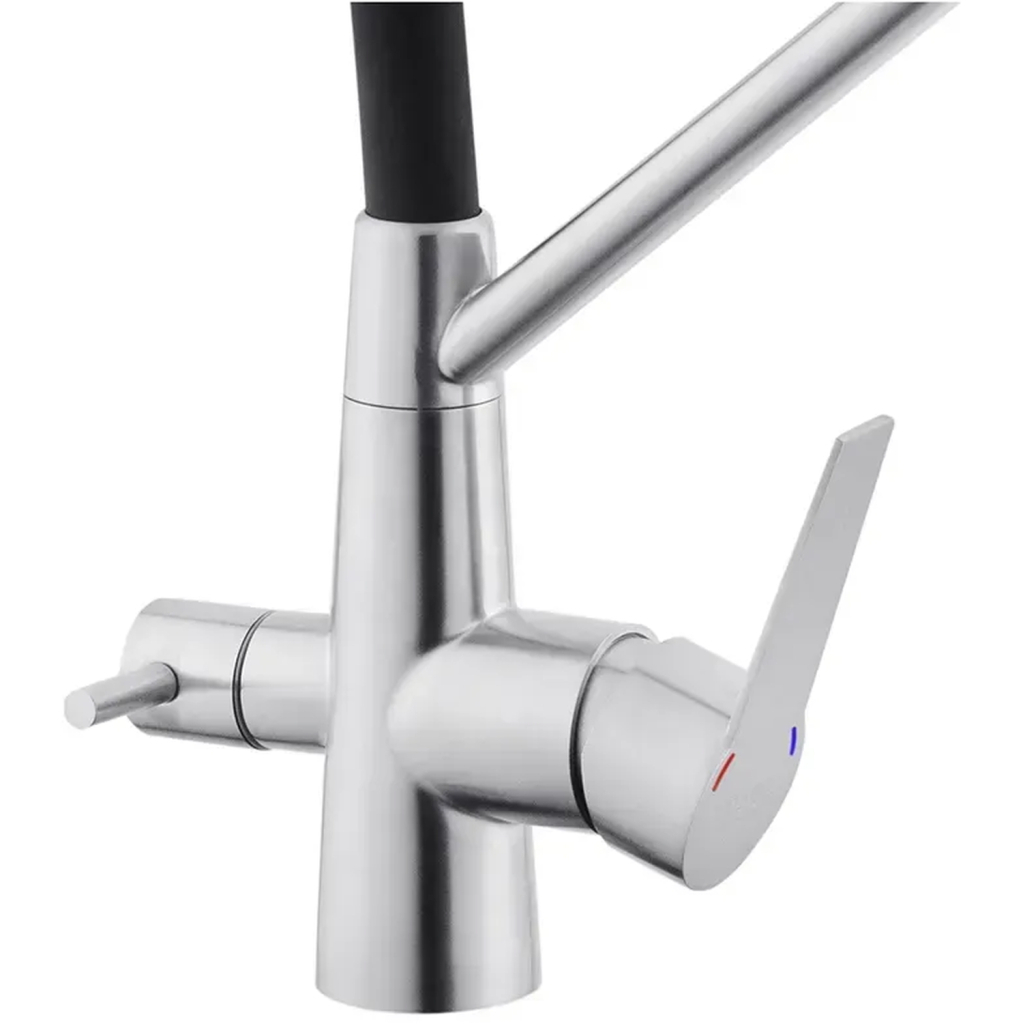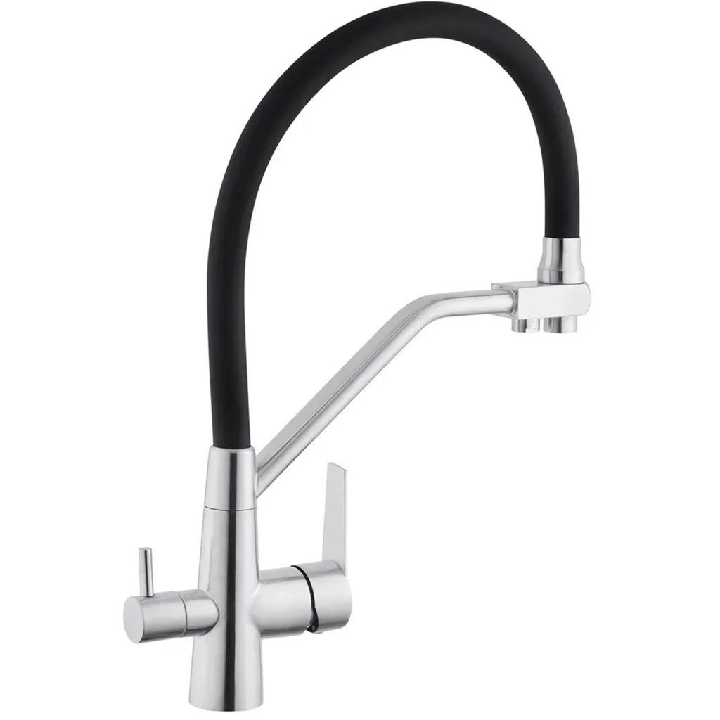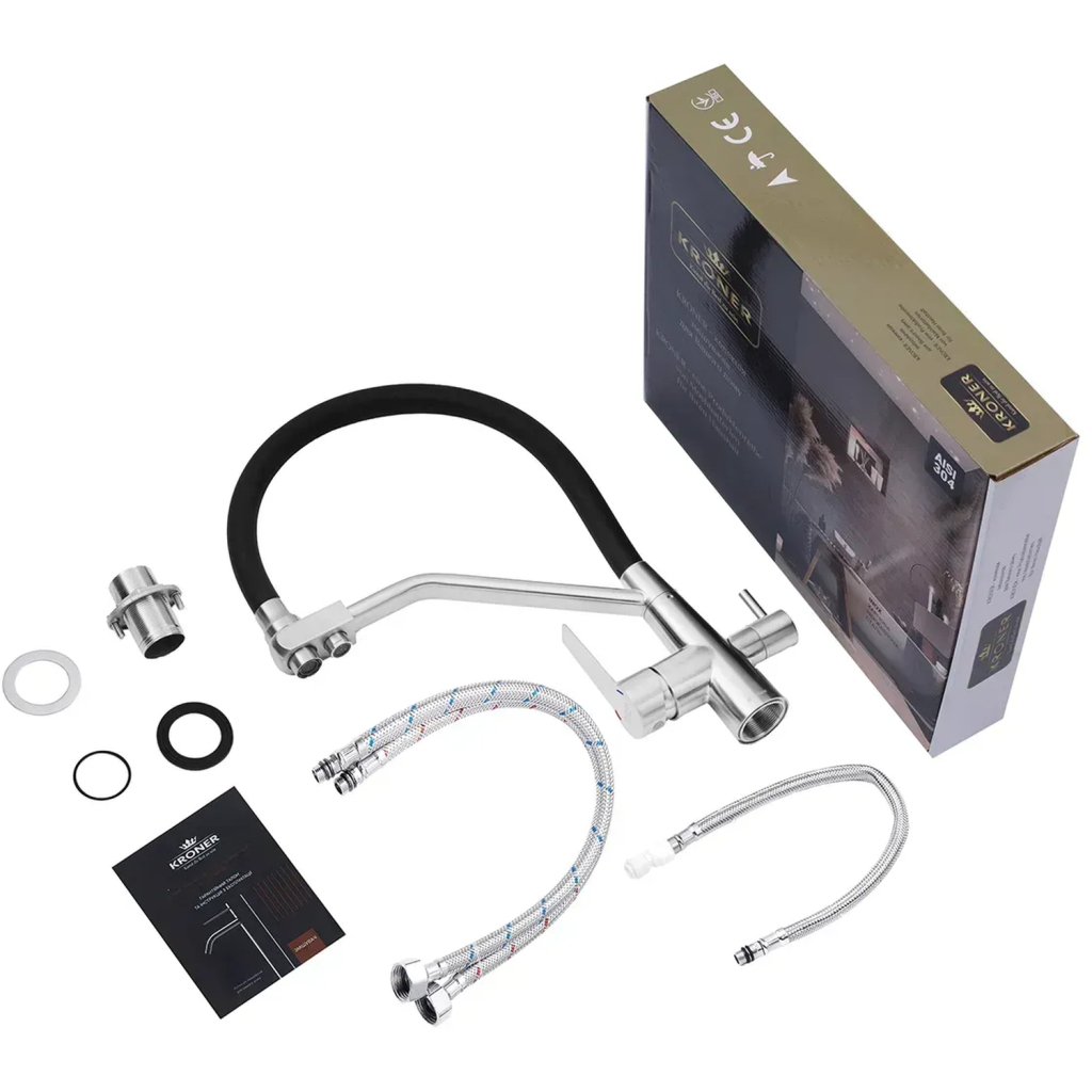 Змішувач Kroner Klassisch-ESG03817BLK – це ідеальний вибір для вашої кухні. Завдяки двохважільному дизайну, він забезпечує зручне та точне регулювання температури і потоку води. Виготовлений з нержавіючої сталі та силікону, цей змішувач не лише стильний, але й надзвичайно міцний і довговічний.