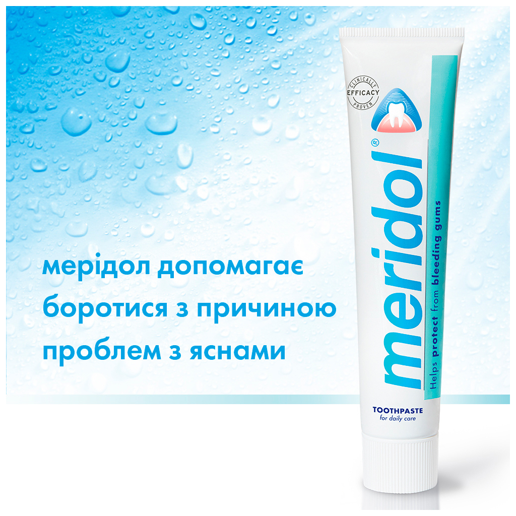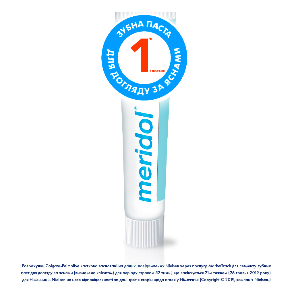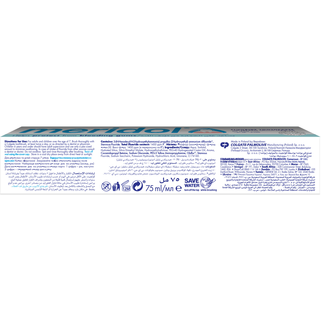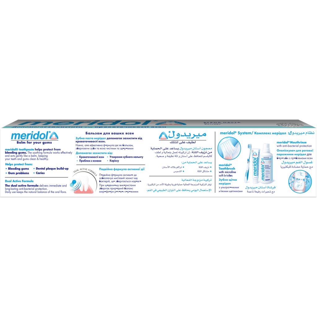 Основні технічні характеристики: Виробник: Meridol, Модель: від кровоточивості ясен 75 мл, Склад: містить олафлур (амінофторид) та фторид олова (II) з вмістом фтору 1400 ppm. Країна-виробник: Польща. Спосіб застосування: Невелику кількість пасти видавити на зубну щітку та чистити зуби 2-3 хвилини вранці та ввечері.