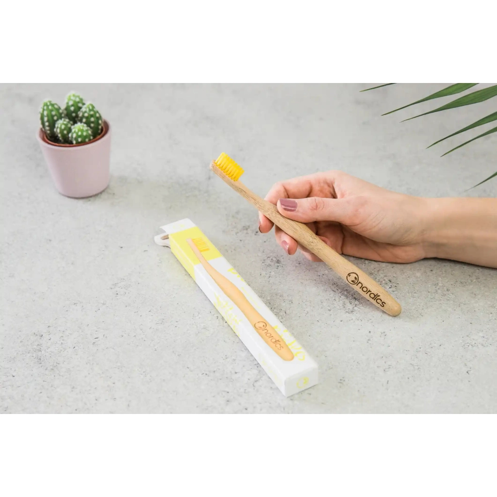 Зубна щітка Nordics Бамбукова Жовта щетина — це ідеальний вибір для тих, хто прагне до екологічного способу життя. Виготовлена з бамбука, який швидко росте і не потребує вирубки лісів, ця щітка є не лише ефективною, але й безпечною для навколишнього середовища. Щетинки з високоякісного нейлону не містять BPA, що робить їх безпечними для щоденного використання. Завдяки маленькій голівці, рекомендованій стоматологами, ви зможете легко дістатися до важкодоступних місць у роті та ефективно видалити наліт.