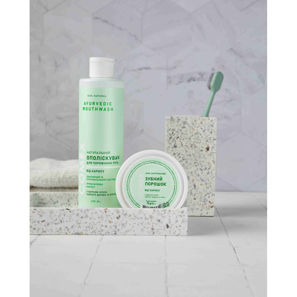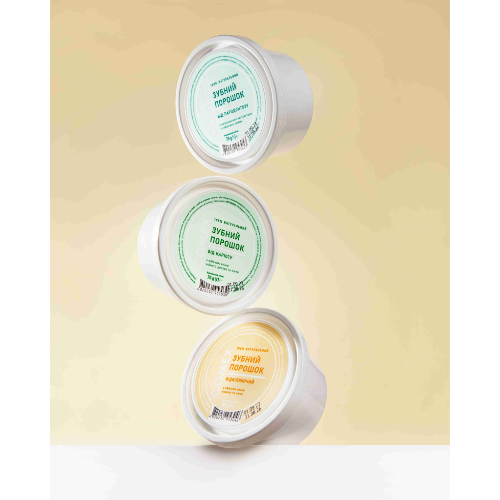 Зубний порошок Comex Натуральний Від карієсу – це ефективний засіб для профілактики карієсу та очищення зубів. Завдяки натуральним інгредієнтам, таким як ефірна олія чайного дерева та м'яти, цей порошок забезпечує свіжість дихання та здоров'я ротової порожнини.